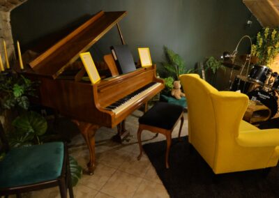 Jestem absolwentką Szkoły Muzycznej im.Karola Lipińskiego w Lublinie w klasie fortepianu. Przez lata doświadczałam różnych form muzyki, od grania na instrumentach poprzez śpiew zawodowy, aż do nauczania tych umiejętności. Muzyka jest dla mnie bardzo użytecznym narzędziem pracy. Wplatanie elementów muzycznych takich jak praca oddechem, głosem, słuchanie muzyki przy jednoczesnej relaksacji czy wizualizacji, ale też twórcze pobudzanie pacjenta, wyrażanie siebie poprzez dźwięk, śpiew, grę na różnych instrumentach jest często przeze mnie wykorzystywaną formą pracy psychoterapeutycznej. Praca taka ma wiele korzyści. Ułatwia wyrażanie emocji pomagając uzewnętrznić to czego nie da się ubrać w słowa. Łagodzi objawy psychosomatyczne, lęki, stany depresyjne. Wpływa na cały organizm – na napięcie mięśni, odczuwanie bólu, ciśnienie krwi, rytm serca. Stanowi dobre uzupełnienie leczenia farmakologicznego. Muzyka wywiera wpływ na sieci neuronowe w mózgu zwiększając jego plastyczność. Redukuje poziom kortyzolu – hormonu stresu. Skuteczność terapii poprzez muzykę została potwierdzona wieloma badaniami naukowymi. W gabinecie do dyspozycji pacjentów jest mikrofon, ale również takie instrumenty jak fortepian, perkusja oraz gitara.
